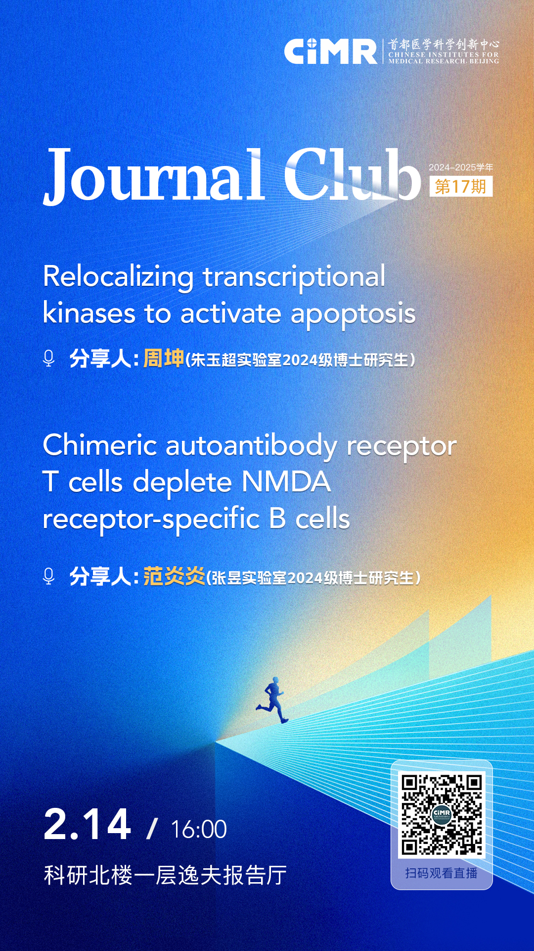 2024级博士研究生 范炎炎(张昱实验室),将探讨的文章是“Reincke SM, von Wardenburg N, Homeyer MA, Kornau HC, Spagni G, Li LY, Kreye J, Sánchez-Sendín E, Blumenau S, Stappert D, Radbruch H, Hauser AE, Künkele A, Edes I, Schmitz D, Prüss H. Chimeric autoantibody receptor T cells deplete NMDA receptor-specific B cells. Cell. 2023 Nov 9;186(23):5084-5097.e18. doi: 10.1016/j.cell.2023.10.001.”
