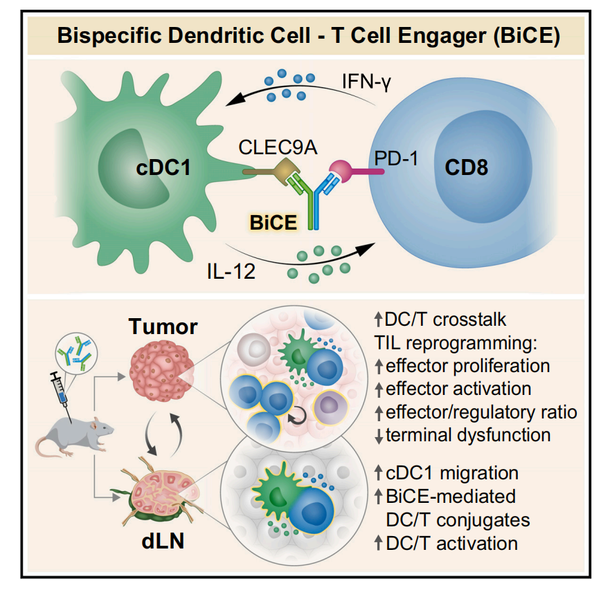 图片总结:一种双特异性抗体促进了传统I型树突状细胞和CD8+ PD-1+ T细胞之间的物理相互作用,增强了apd-1介导的反应所需的免疫通路,并具有强大的抗肿瘤治疗活性。