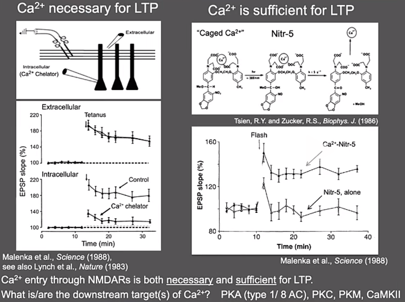 Induction阶段:钙离子作为神经电活动十分重要的离子,其在LTP诱导过程中是否发挥作用呢?Roger首先对钙离子的重要性进行了探究。他们发现在加了钙离子的螯合剂之后,强直刺激引起的单细胞水平上的LTP出现显著的降低,这证明钙离子对于LTP的形成是必要的;为进一步证明钙离子对LTP的形成是充分的,他们利用通常情况下能“锁住”钙离子,光照之后能“释放”钙离子的化学物质Nitr-5处理离体脑片,发现在给予光照之后,提前锁住了钙离子的Nitr-5显著增强了LTP,而没有锁住钙离子的Nitr-5则不行,这证明了钙离子对于LTP的形成是充分的。通过给神经元胞内加入CaMKII的抑制型多肽(inhibitory peptide),他们进一步证明作为钙离子下游的CaMKII对LTP的形成也很重要。反过来,表达持续激活型的CaMKII,同样可以模拟LTP的发生。这一系列实验说明CaMKII是LTP形成的最重要蛋白分子。