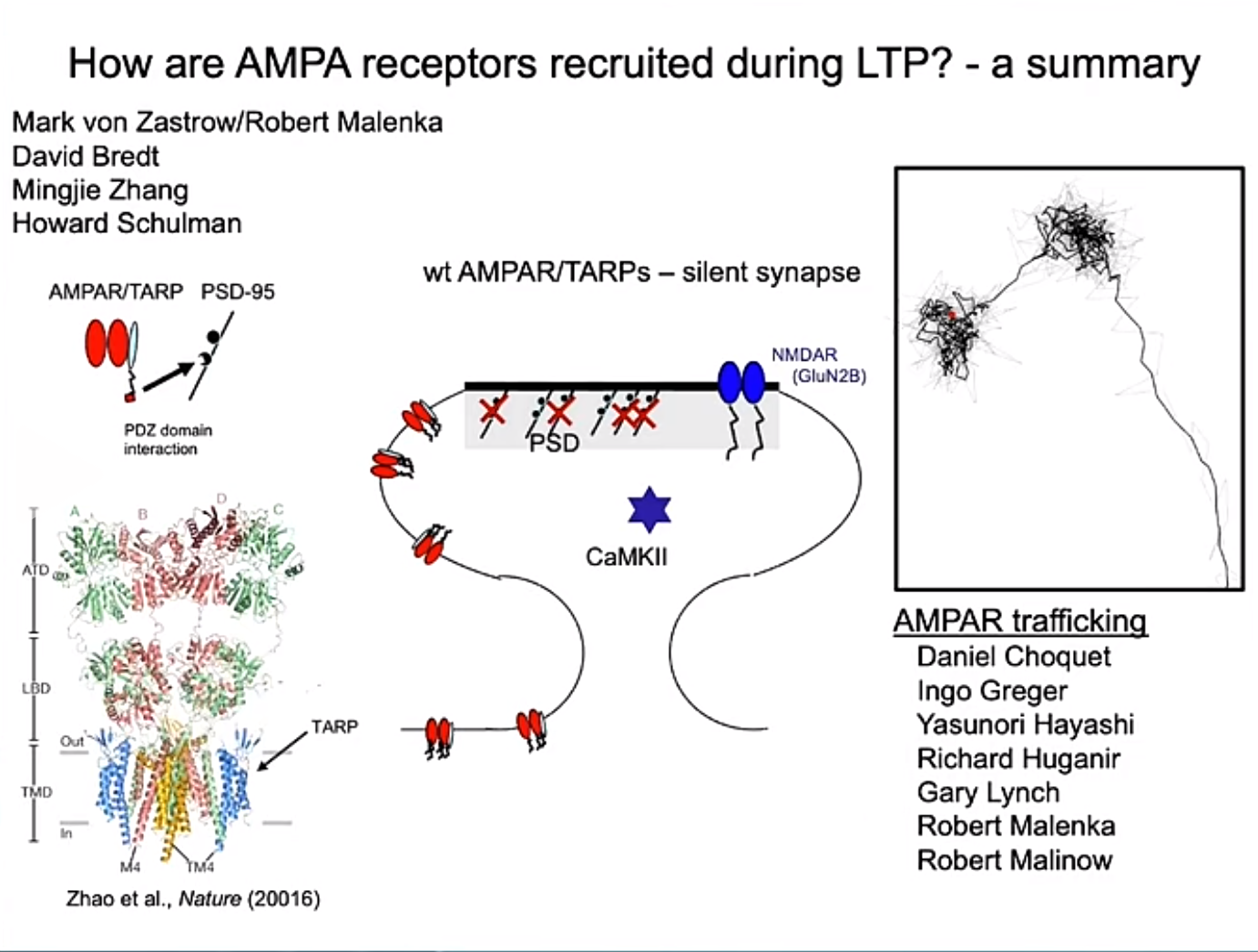 Expression阶段:对于突触前机制与突触后机制在LTP中的作用,领域内有很长一段时间的争议。突触前机制假设认为,LTP的增强是通过突触前神经元释放更多的谷氨酸实现的:LTP后谷氨酸释放概率的提升,导致突触后AMPA受体和NMDA受体的响应都增强,且突触前释放的神经递质无法触发突触后反应在LTP后减少。而突触后机制假设认为,LTP的增强源于突触后AMPA受体的数量或活性增加,而突触前释放不发生显著变化:LTP后AMPA响应增强,而NMDA响应保持不变;原本仅有NMDA受体的突触在LTP后通过增加AMPA受体被“唤醒”。Roger总结了他的实验室关于LTP过程中AMPA受体被招募的机制研究,通过成像、电生理以及分子生化等手段研究,他发现:1. AMPA受体在细胞膜上自由运动,可通过布朗运动进入或离开突触区;2. CaMKII被NMDA受体激活后,与PSD-95蛋白的相互作用解除屏蔽作用,而AMPA受体则通过辅助蛋白TARP与PSD-95结合,被稳定捕获到突触后致密区,这一机制对LTP形成至关重要。