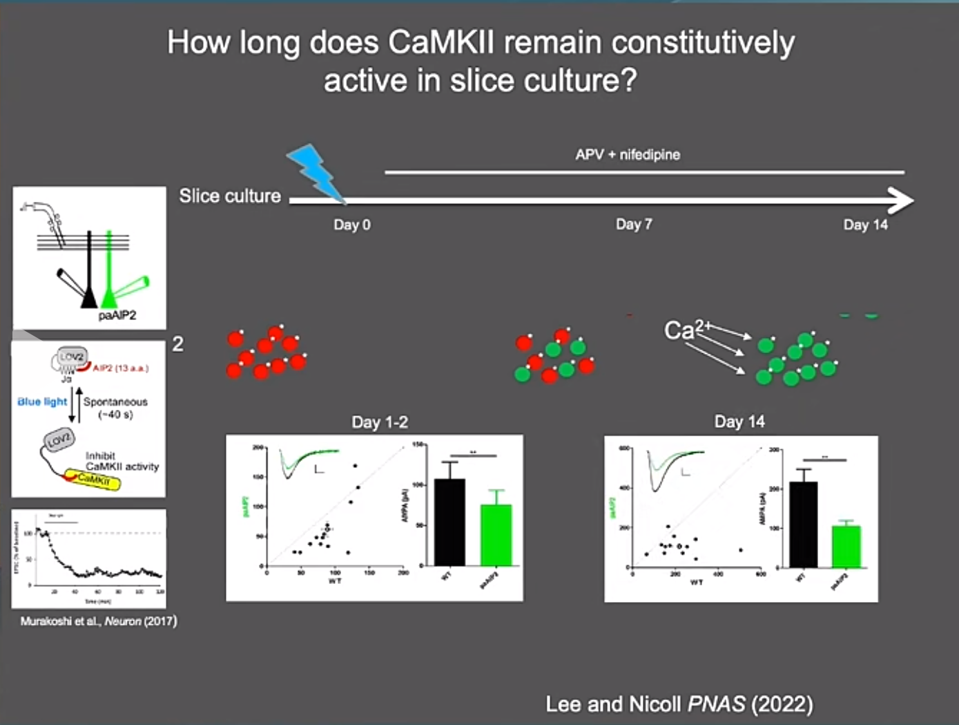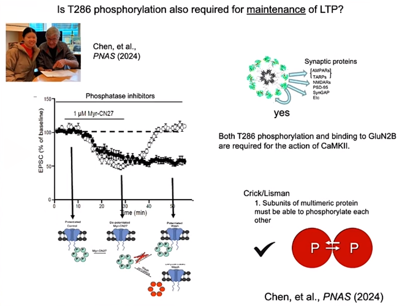 CaMKII被认为在记忆的储存过程中起着至关重要的作用。CaMKII是一个具有12个亚基的多聚蛋白质,在神经元的突触处,它能够通过自磷酸化过程,持续激活,保持其生物学活性。其关键机制之一是钙离子结合钙调蛋白后,促使CaMKII的自磷酸化。但CaMKII的磷酸化是否与LTP有关一直存在争议。Roger实验室使用了一个可以透过细胞膜的棕榈酰化修饰的多肽myr-CN27来抑制CaMKII的磷酸激酶活性,发现CaMKII激酶活性,特别是,286位丝氨酸的磷酸化,以及CaMKII与GluN2B的结合对于LTP maintenance十分重要。