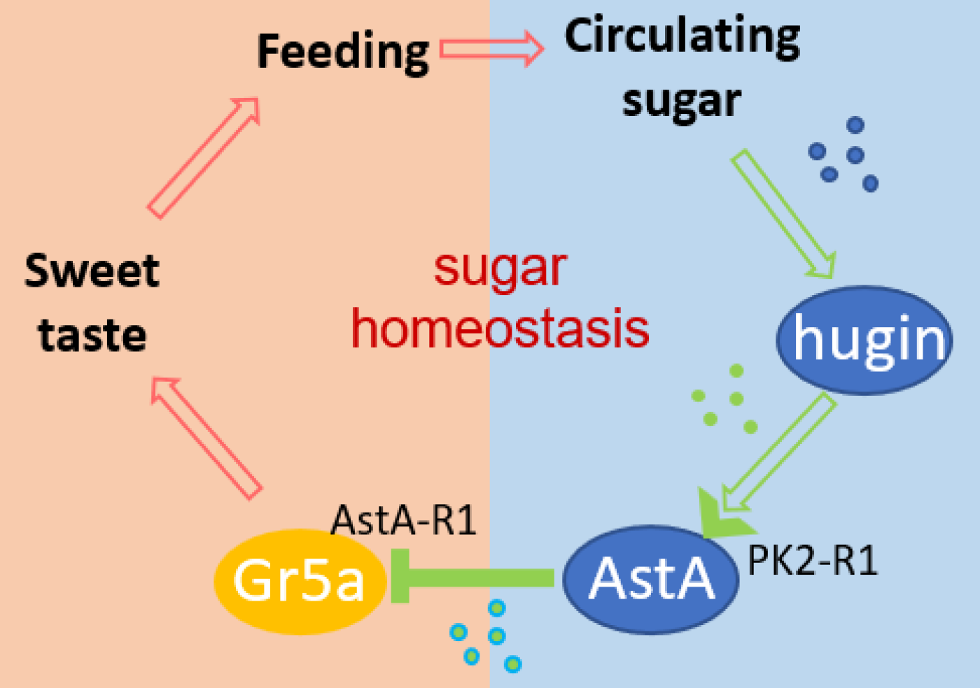 研究团队首先在果蝇中发现,当果蝇饱餐后,体内葡萄糖水平的升高会直接激活其大脑中的一组Hugin神经元。这些神经元像体内的“血糖仪”,一旦检测到高能量信号,就会释放Hugin神经肽。Hugin神经肽随即激活下一级的AstA神经元,促使它们释放AstA神经肽。最终,AstA信号精确地作用于前端感受甜味的味觉神经元,直接抑制了它们的活性。这就像是给味觉的“前线哨兵”下达了“暂停”指令,导致果蝇对甜味的敏感度显著下降,不再像饥饿时那样热衷于摄取糖分。