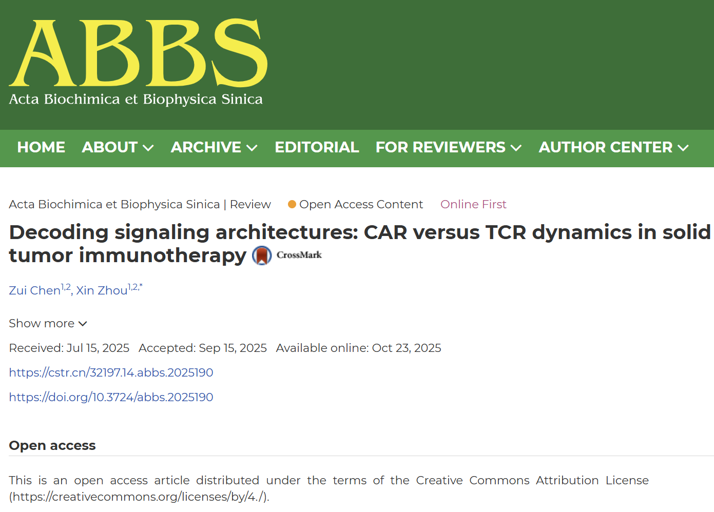 本文基于周欣研究员团队发表于Acta Biochimica et Biophysica Sinica的综述“Decoding Signaling Architectures: CAR vs TCR Dynamics in Solid Tumor Immunotherapy”进行整理,旨在科普前沿进展,具体治疗方案请务必遵从主治医师的指导。