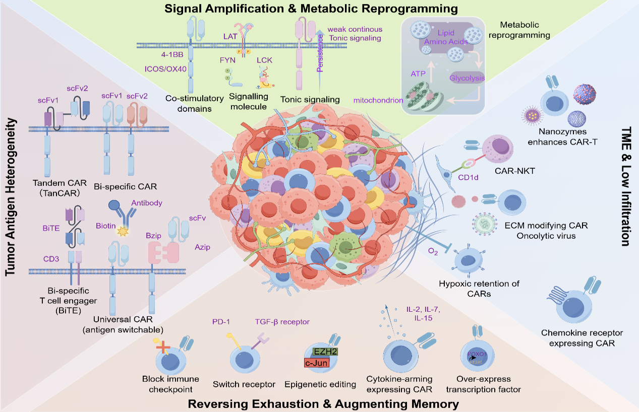 周欣团队的综述指出,突破实体瘤壁垒需要一套组合拳,从多个维度对CAR-T进行智能化升级:
