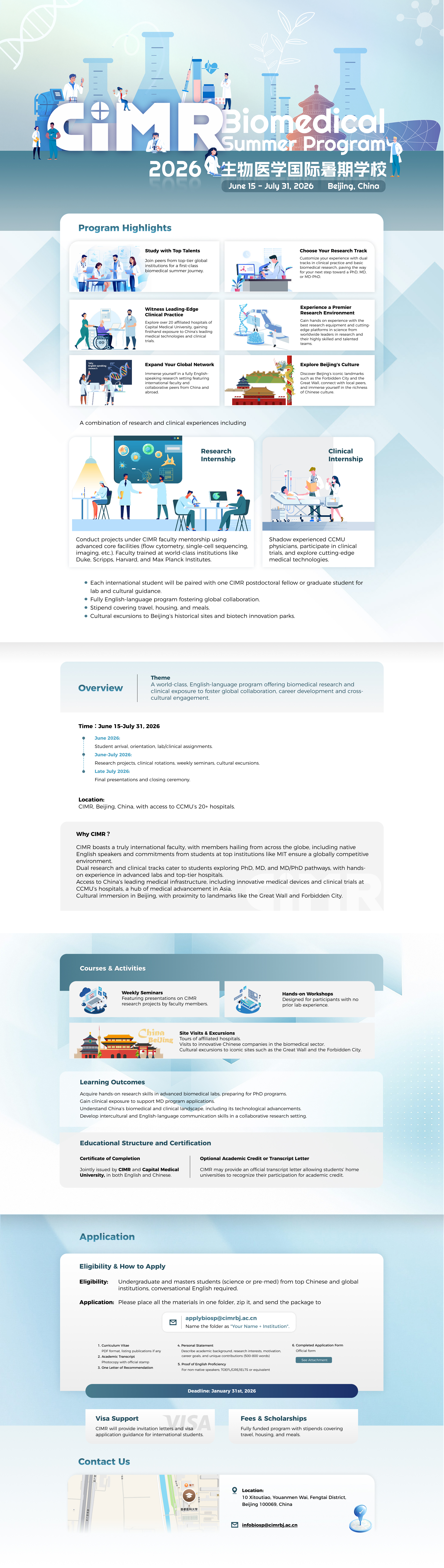 A: No application or tuition fee. Daily meals and accommodation will be provided during the program. CIMR will reimburse economy class seat flight tickets for international students (up to $2000/$1500) and domestic students (up to $500).