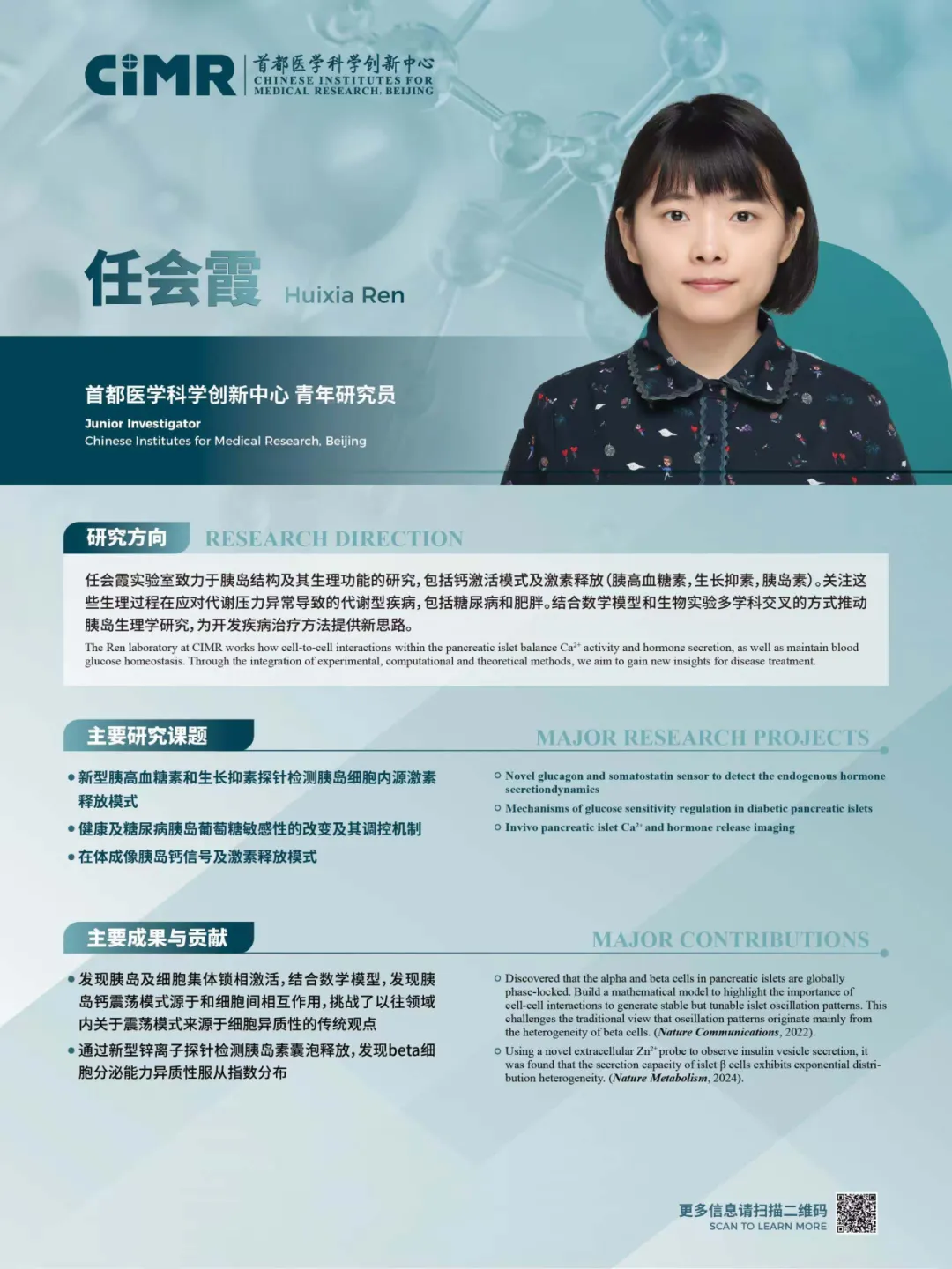 任会霞长期致力于胰岛结构及其生理功能的研究,重点关注葡萄糖刺激胰岛钙激活模式及胰高血糖素、生长抑素、胰岛素等激素释放机制,聚焦代谢压力异常引发的糖尿病、肥胖等代谢性疾病,通过数学模型与生物实验相结合的多学科交叉方法,为疾病治疗提供新思路。其团队发现胰腺胰岛的节律性振荡源于δ细胞与α细胞间的相互作用,并发展了在体胰岛群体活动实时成像及血糖同步连续检测技术,发现高低血糖切换直接调节胰岛节律应答与激素分泌,相关研究成果为低血糖与糖尿病的机制研究和临床干预提供了新思路。