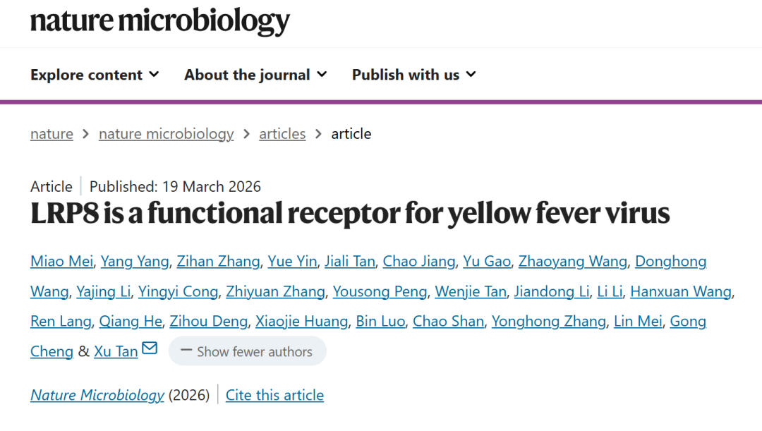 2. Miao Mei, Y.Y., Zihan Zhang, Yue Yin, Jiali Tan, Chao Jiang, Yu Gao, Zhaoyang Wang, Donghong Wang, Yajing Li, Yingyi Cong, Zhiyuan Zhang, Yousong Peng, Wenjie Tan, Jiandong Li, Li Li, Hanxuan Wang, Ren Lang, Qiang He, Zihou Deng, Xiaojie Huang, Bin Luo, Chao Shan, Yonghong Zhang, Lin Mei, Gong Cheng, Xu Tan. LRP8 is a Functional Receptor for Yellow Fever. Nat Microbiol., 2026. DOI: 10.1038/s41564-026-02278-7.