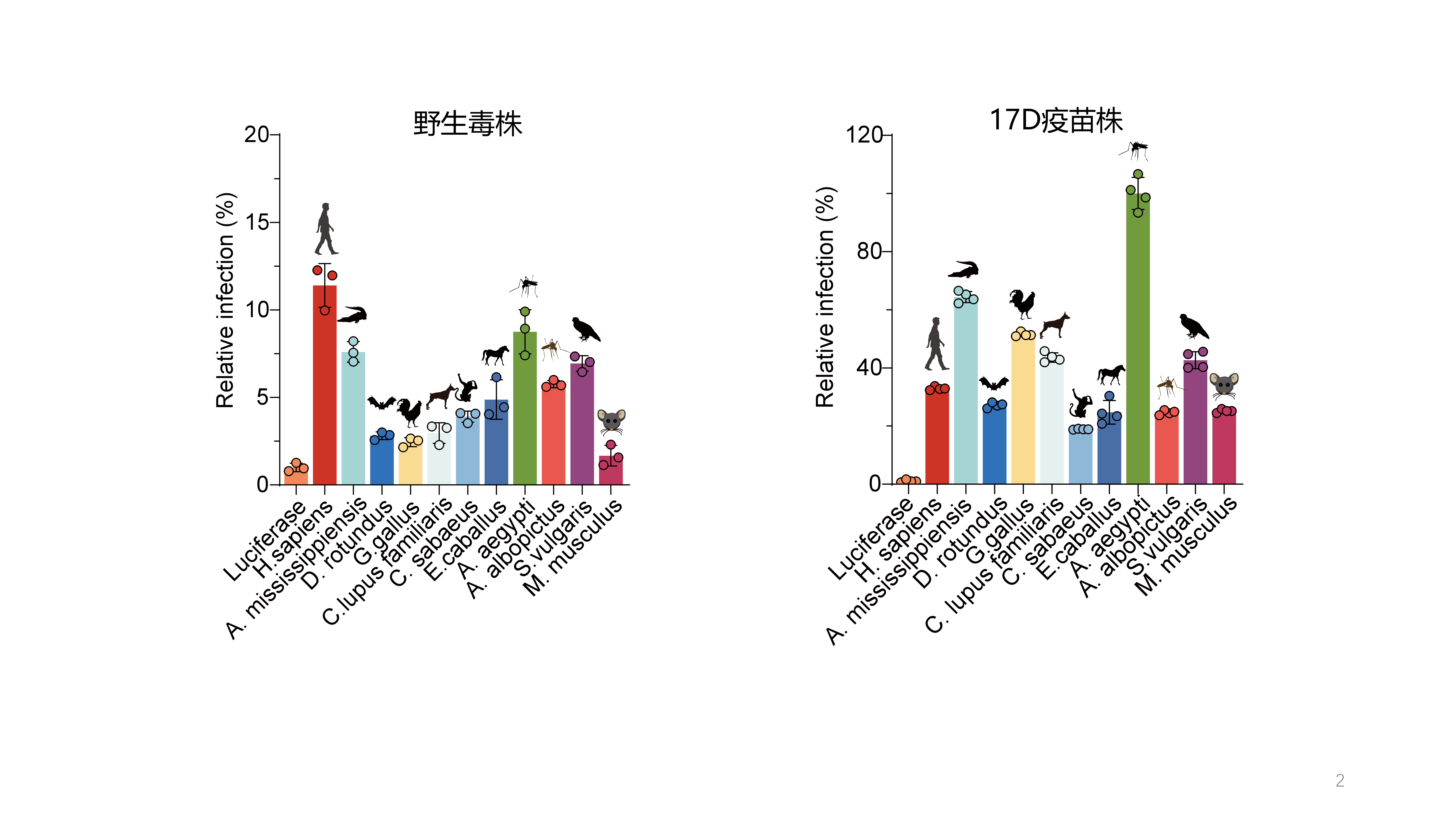 图1:野生型黄热病毒和疫苗毒株被不同物种LRP8蛋白促进入胞的效率比较。(疫苗毒因在小鼠和鸡的组织中经历多次传代,产生了针对这两个物种受体的适应性变异,其对小鼠和鸡的LRP8受体的利用效率显著高于野生型毒株。)