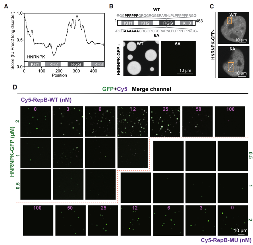 李丕龙教授团队首先确认了HNRNPK自身可以发生相分离。HNRNPK具有多个可以和RNA结合的结构域,包括3个KH结构域和1个RGG(精氨酸-甘氨酸-甘氨酸)结构域。其中RGG结构域属于一种内在无序序列(Intrinsically Disordered Region, IDR,图2A),可以通过多价相互作用在胞内或者体外自组装成液滴(图2B,C)。如果将介导该相互作用的关键氨基酸进行突变,该蛋白就会丧失形成液滴的能力。在该过程中,如果加入野生型的 RepB RNA-WT序列(Xist上负责定位失活X染色体的核心序列),可以显著促进HNRNPK 形成液滴;而如果加入无法与HNRNPK结合的突变型RepB-MU,则不能观察到该促进现象(图2D)。