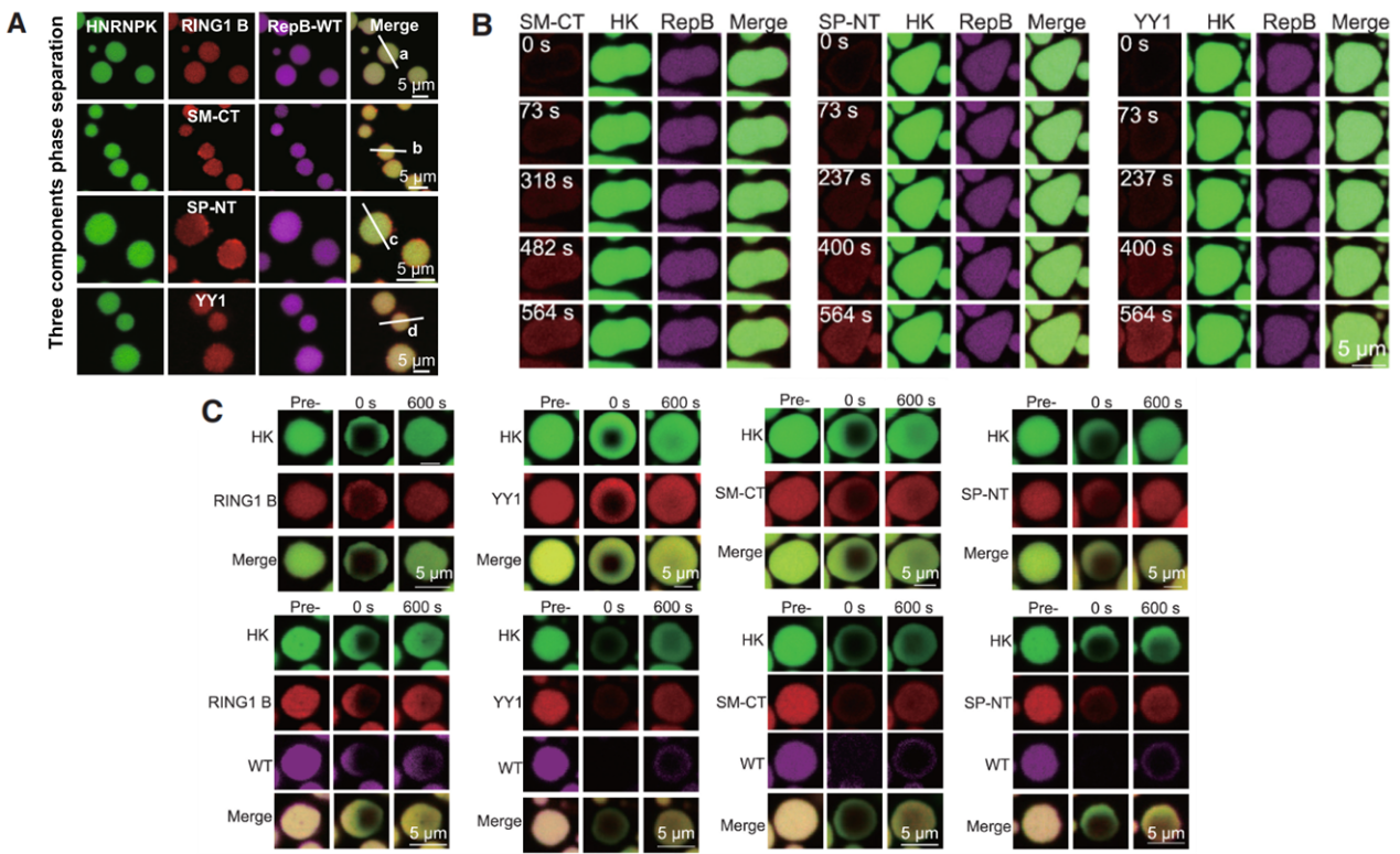 研究团队进一步构建了多种XCI因子的融合蛋白,发现这些因子可以和HNRNPK-RepB一同形成共凝聚体(图3A)。同时,在已经形成HNRNPK-RepB凝聚体的体系中加入其他XCI因子时,这些游离蛋白会被逐渐招募、内化并富集进入已有的凝聚体内部(图3B)。通过光漂白恢复实验(FRAP)对这些液滴进行局部荧光淬灭,经过一段时间后发现淬灭区域的荧光逐渐恢复,直接证明了该凝聚体内部具有液体的动态流动性(图3C)。