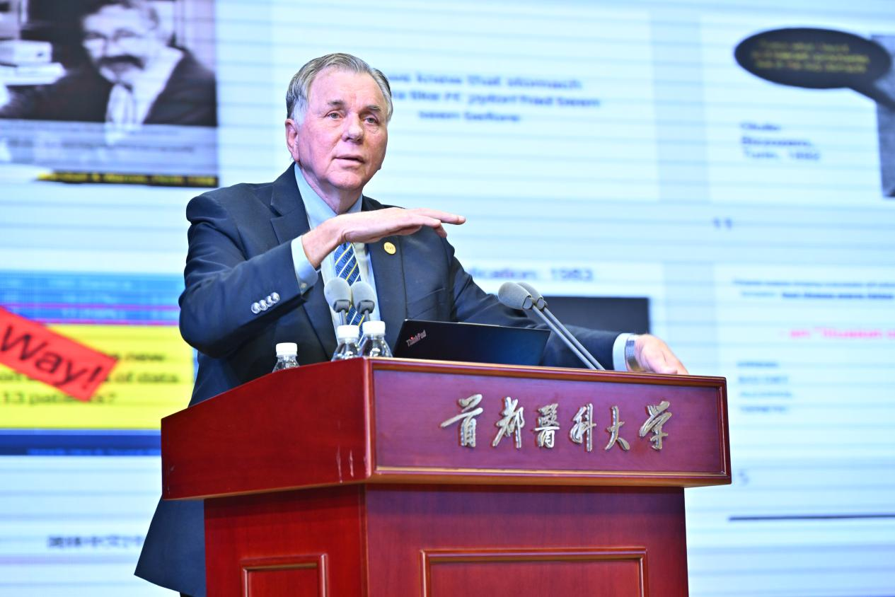 马歇尔教授是幽门螺杆菌致病机制的奠基人与开拓者,他与罗宾·沃伦教授共同发现幽门螺杆菌,并凭此斩获2005年诺贝尔生理学或医学奖。这一成果彻底颠覆了传统认知,革新了胃溃疡的临床治疗方案,在全球医学领域具有里程碑意义。本次讲座中,他深度拆解从科学假说提出、实验验证到临床成果转化的全链条创新路径,其独到的科研理念与执着的探索精神引发现场师生热烈反响。