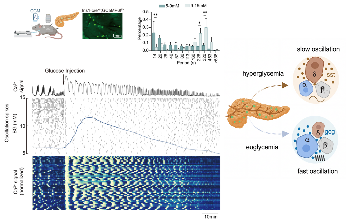近年研究已证实,胰岛的节律性振荡对血糖控制至关重要。然而,一个核心问题长期未解:人体胰腺中分布着上百万个胰岛(小鼠约数千个),它们如何像一支交响乐团般协同“演奏”,共同维持血糖稳定?目前的研究局限于单个胰岛或离体组织,缺乏在活体水平同步观测数十甚至上百个胰岛动态行为的技术手段。因此,在血糖从高到正常、从稳定到波动的变化过程中,成百上千个胰岛如何协同“换挡”,感知并编码血糖状态,仍有待揭示。