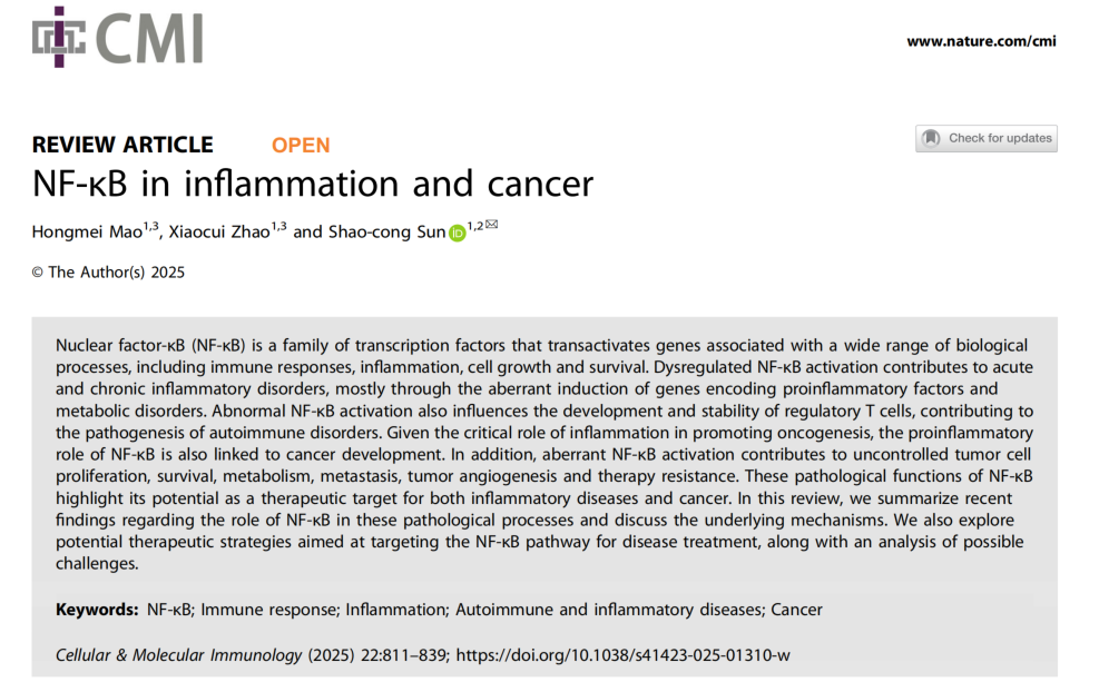 首都医学科学创新中心免疫学研究所孙少聪团队近期在Cellular & Molecular Immunology 发表题为“NF-κB in inflammation and cancer”的权威综述。文章系统阐述了核因子κB(NF-κB)在炎症性疾病和肿瘤发生中的分子机制及治疗潜力,为相关靶向药物研发提供了全新理论框架。