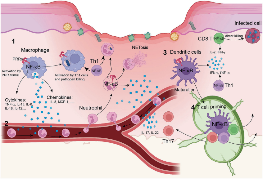 NF-κB是一类高度保守的转录因子,调控数百个目标基因,包括促炎因子(如TNF-α、IL-6、IL-1β)以及细胞存活和增殖相关基因。长期以来被视为免疫系统的“忠诚卫士”。它能瞬间激活数百个基因,指挥TNF-α、IL-6等炎症因子冲锋陷阵,对抗感染。在正常免疫反应中,如急性炎症阶段,NF-κB扮演着保护性角色,快速招募免疫细胞,有效清除病原体,帮助机体抵御感染。