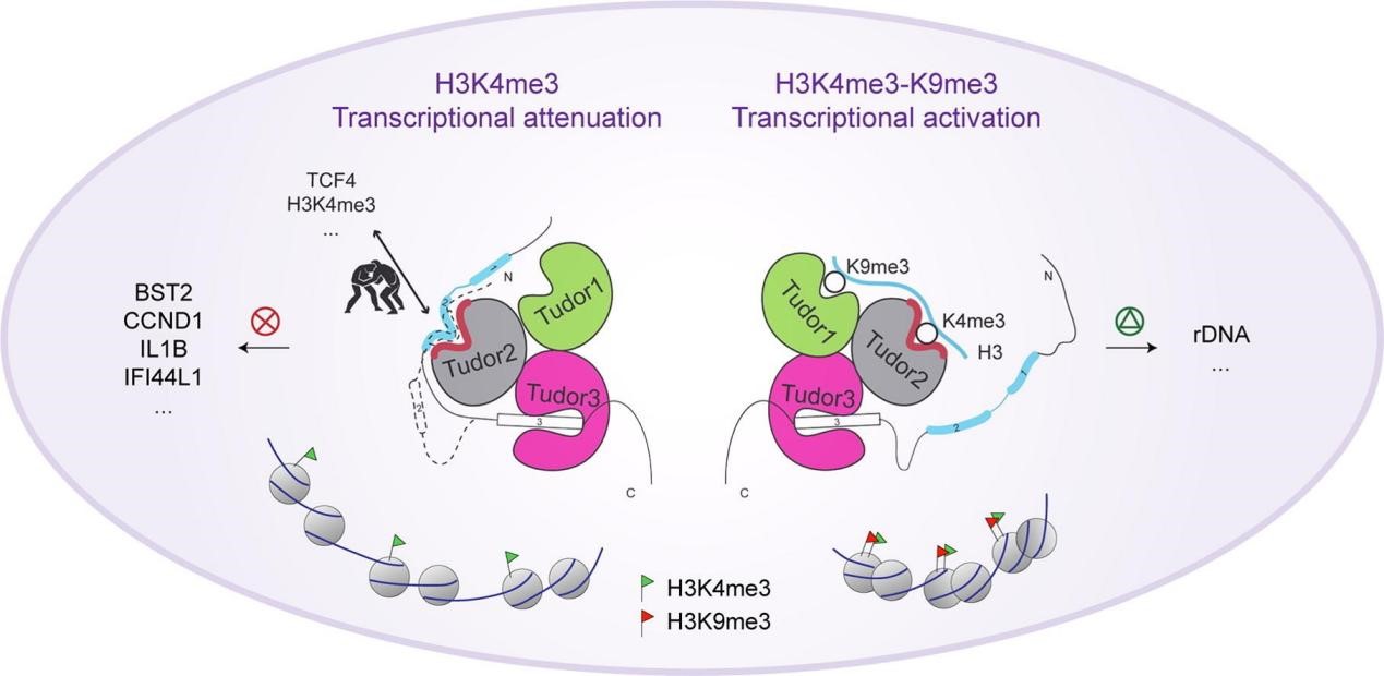 李老师分享的其中一个关于组蛋白甲基化研究的故事令人印象深刻。在这项研究中,李老师团队发现同一个组蛋白修饰“阅读器”识别不同组蛋白修饰组合产生不同的基因表达调控结果。具体来说,转录共激活因子Spindlin1拥有三个串联的Tudor结构域,其中第一和第二个Tudor结构域的芳香笼口袋能够识别多种组蛋白甲基化修饰类型,包括H3K4me3、H4K20me3、H3K4me3-R8me2a和 H3K4me3-K9me3等。然而,第三个Tudor结构域不具备完整的芳香笼口袋,其功能尚不完全清楚。2017年,有研究发现SPINDOC蛋白是Spindlin1的相互作用蛋白,并发现其能削弱Spindlin1的转录激活作用,但具体机制尚未明了。李老师课题组与合作者针对这一问题在J Mol Biol杂志上发表的最新研究成果表明Spindlin1的第三个Tudor结构域能够识别SPINDOC蛋白的一段疏水肽段从而形成稳定的复合物,而位于疏水肽段前的碱性肽段可以竞争性抑制Spindlin1对组蛋白H3K4me3的识别,从而减弱Spindlin1对下游基因的转录共激活作用。然而,当H3K4me3和H3K9me3同时存在时,这种竞争结合机制便不存在。